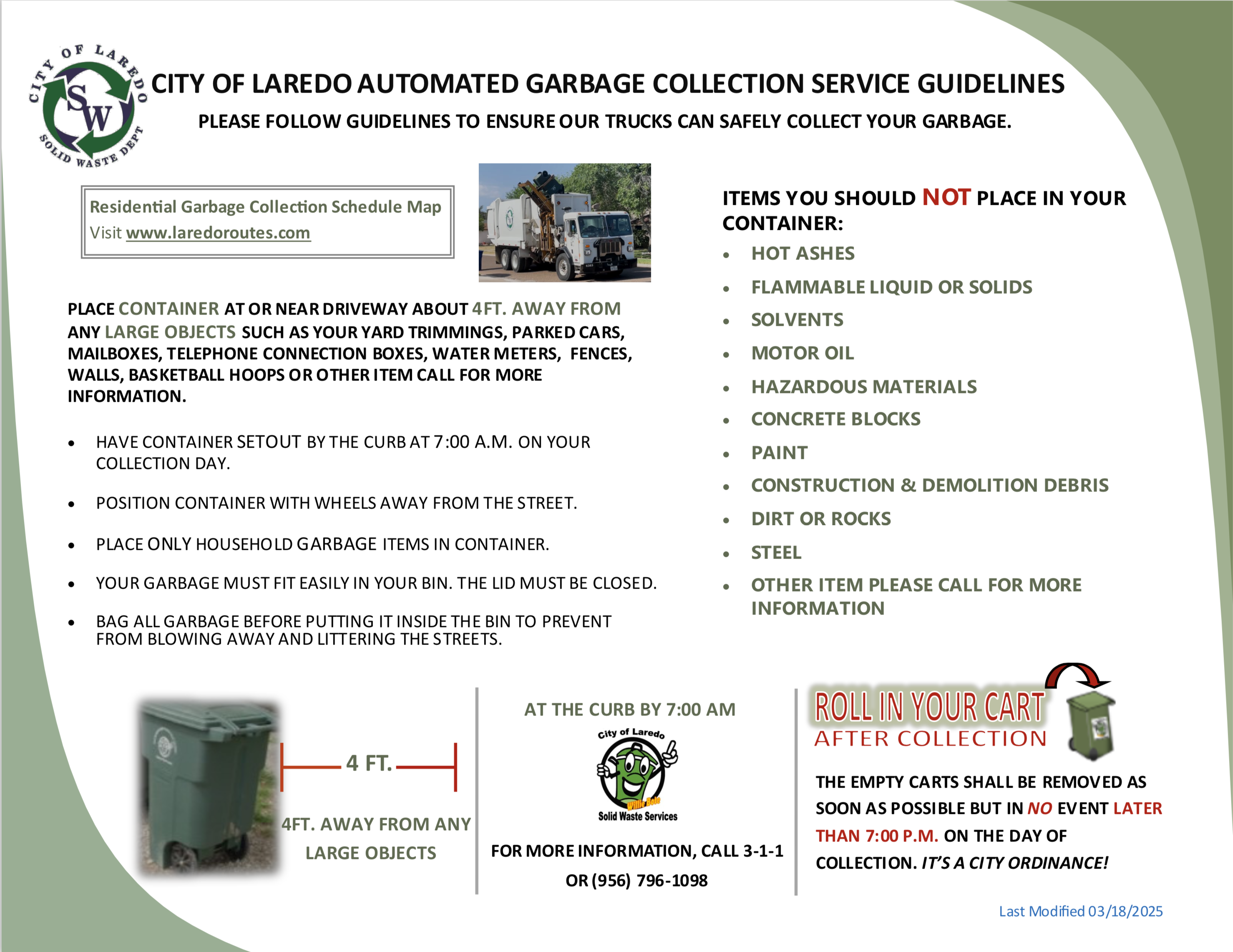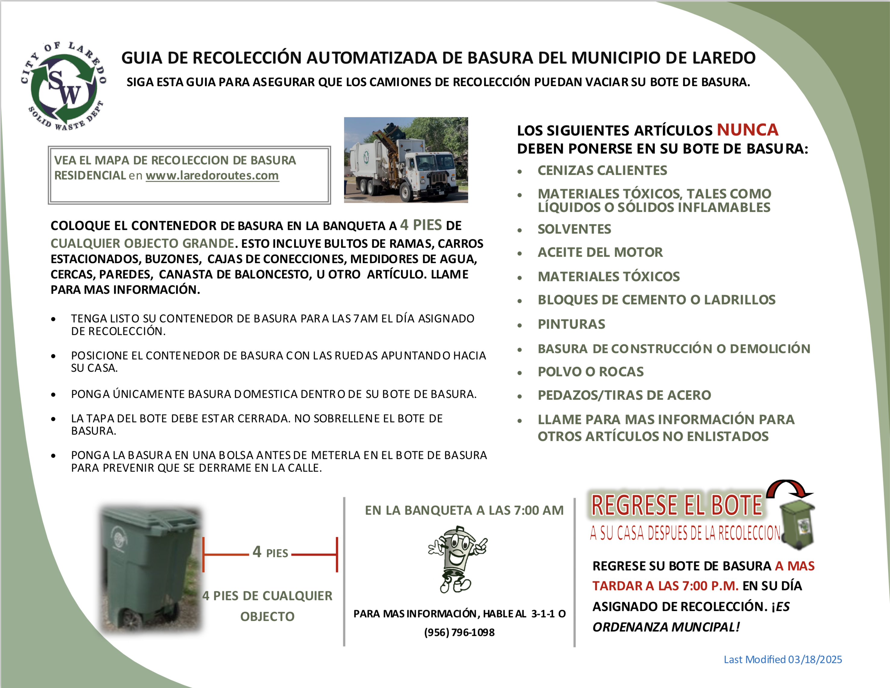 Debido al crecimiento y desarrollo de la Ciudad de Laredo, algunas rutas de recolección de basura residencial del bote verde Willie Bote cambiaran de fecha de servicio a los miércoles empezando el 15 de julio, 2024.